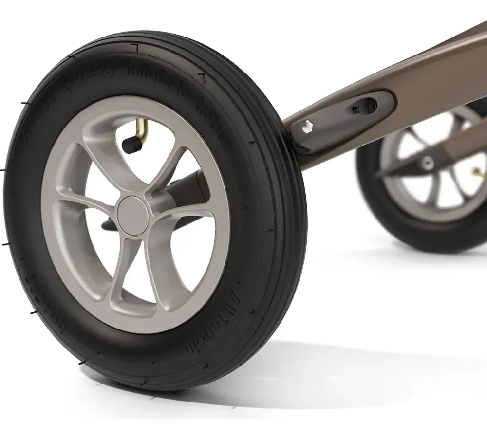 Rodas: Pneus pneumáticos com câmara interna – 26 cm de diâmetro e 5 cm de largura